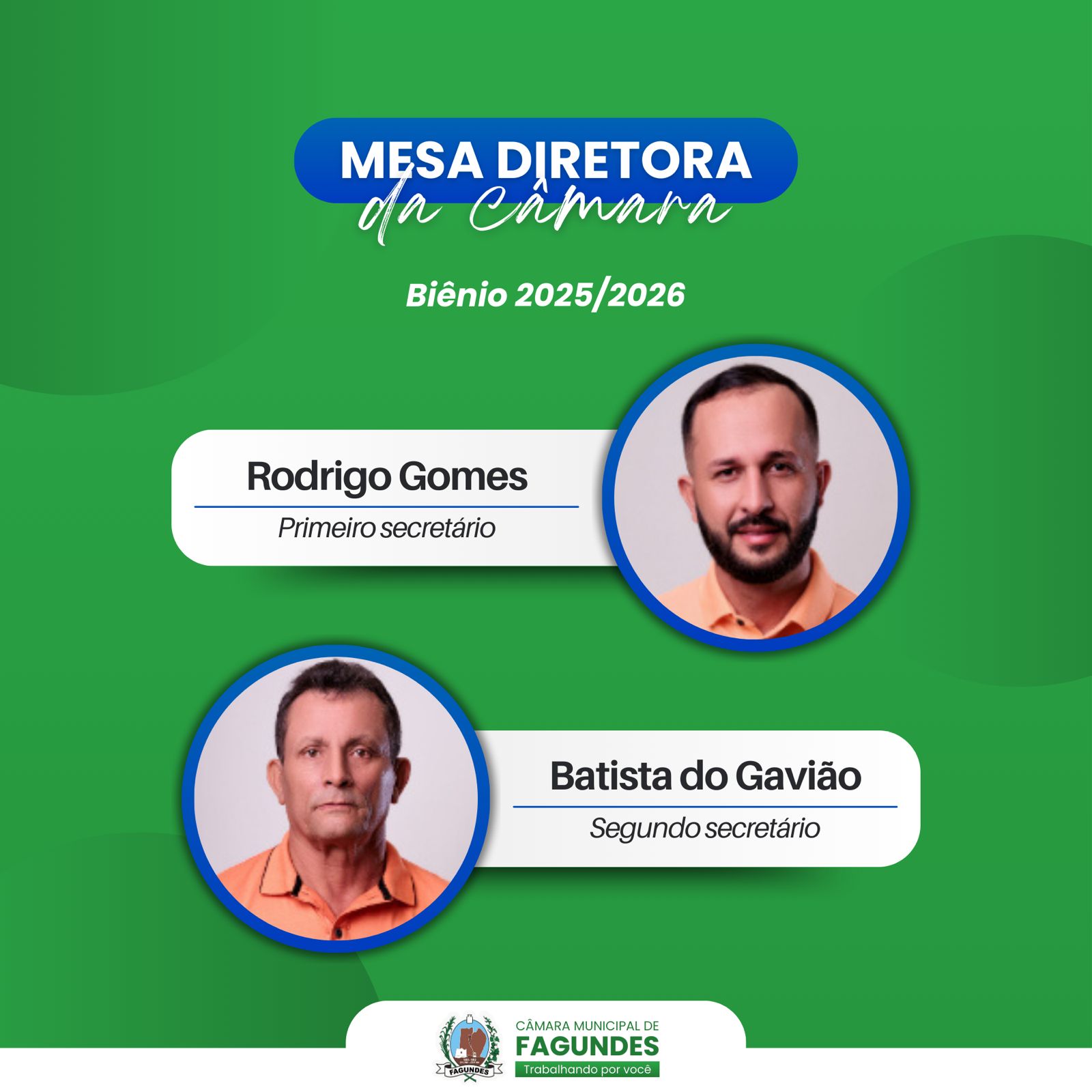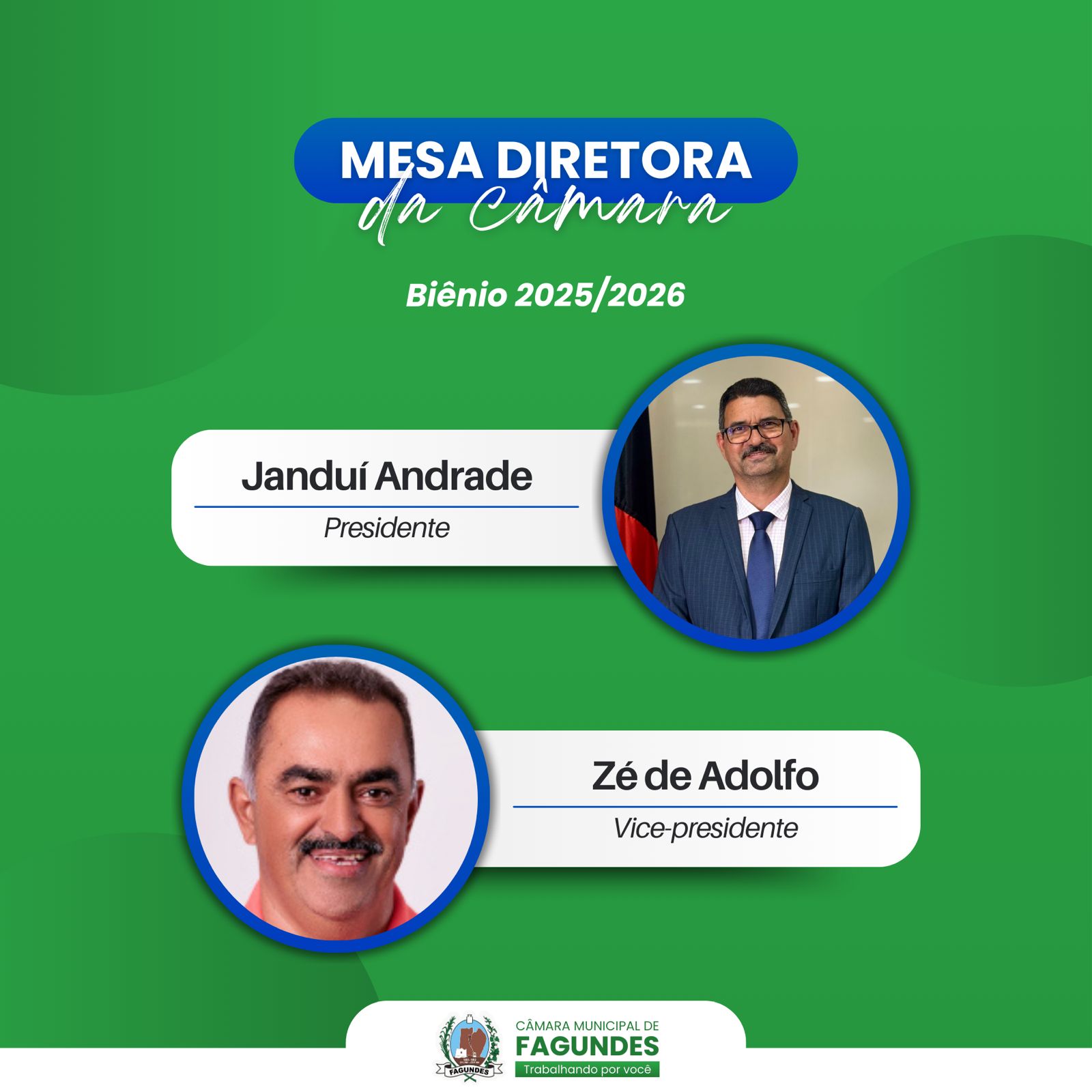 A Câmara Municipal de Fagundes apresenta a nova Mesa Diretora, unida pelo compromisso de representar os interesses do povo fagundense e trabalhar por um futuro melhor para todos! 🤝
